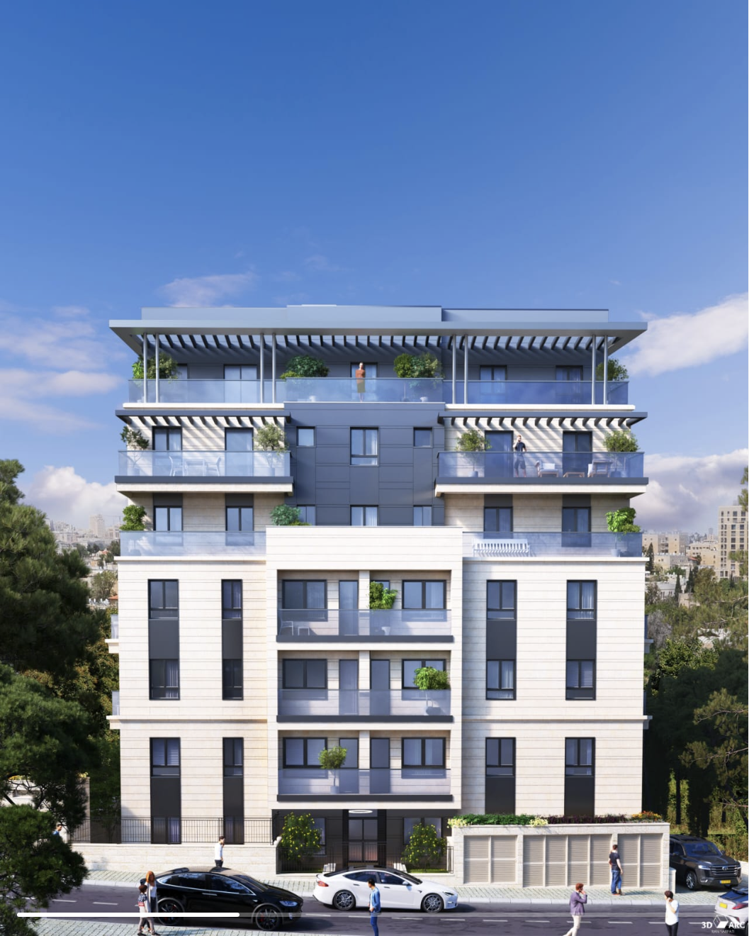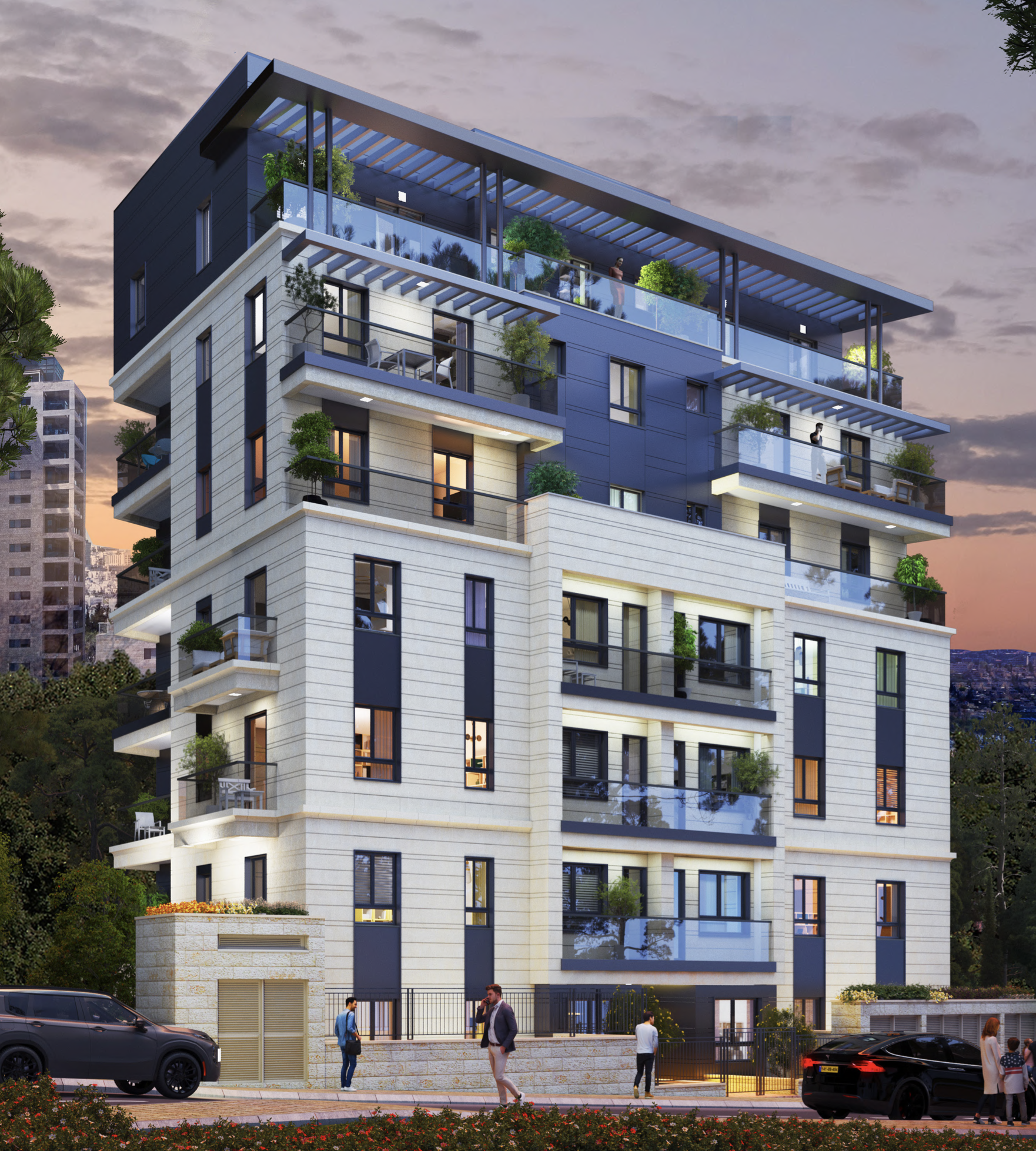 A prestigious 7-story building with 16 residential units, including garden apartments, a penthouse apartment and mid-rise apartments, on top of a conventional underground parking lot containing parking spaces and storage rooms.